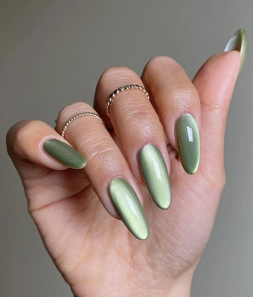С зеленым сланцем вообще не нужно ничего придумывать. Достаточно взять лак с сатиновым финишем и эффектом кошачьего глаза и сделать завораживающее однотонное покрытие. Этот нейл-арт захочется разглядывать вблизи, ведь в зависимости от света он каждый раз будет выглядеть по-разному, и при этом всегда оставаться спокойным и благородным. Денежный маникюр на апрель 2026 в таком исполнении работает на устойчивость и долгосрочные накопления. Никакой суеты, никаких быстрых денег — только то, что будет с вами надолго.