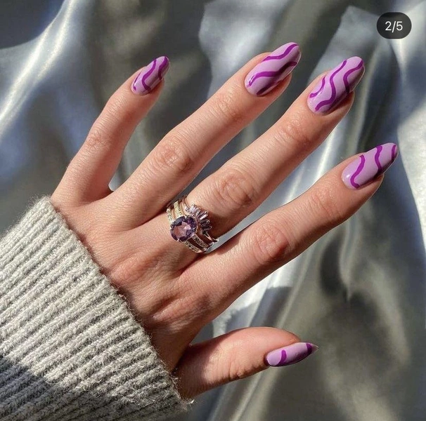 С цветом аметистовая орхидея легко переборщить, ведь слишком броский дизайн может выглядеть попросту пошло. Но мы нашли способ, как сделать его деликатным: берем нежную сиреневую подложку и поверх рисуем тонкие хаотичные извилистые линии более насыщенным аметистовым оттенком. Получается абстрактно, игриво и совсем не вульгарно — как желейные червячки, которые разбежались по ногтю. Такой денежный маникюр на апрель 2026 подойдет тем, кто не хочет скучных решений, но и не готов к откровенным экспериментам. Он про нестандартный подход к финансам и умение находить возможности там, где другие проходят мимо.