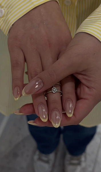 Обычный френч на прозрачной основе, но с одним «вкусным» отличием: улыбка здесь не белая, а нежно-банановая. Сверху все это покрыто жемчужной втиркой, которая мягко переливается на свету, как сахарная глазурь на свежем пончике. Никакой кричащей яркости — только теплота и аккуратность. Денежный маникюр на апрель 2026 в таком исполнении настраивает на легкие, несуетливые деньги. Он напоминает, что финансы могут приходить без надрыва, просто потому, что вы в хорошем настроении и в своем ритме.