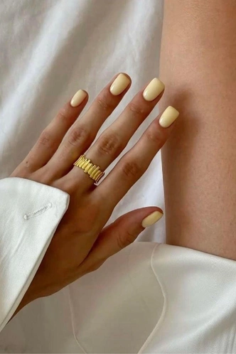 Начнем с бледно-бананового — очень теплого, мягкого желтого с молочной дымкой. В нем нет кислоты или вызова, только свет и спокойствие. Денежный маникюр на апрель 2026 в этом оттенке создает ощущение уюта и напоминает, что деньги любят не только тех, кто суетится, но и тех, кто умеет расслабляться. Цвет работает как теплый фон: он не перетягивает внимание на себя, зато подсвечивает ваши идеи и планы, делая их более ясными и достижимыми. Это оттенок для тех, кто хочет привлекать финансы легко и без надрыва.