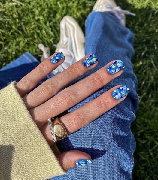 Этот дизайн выглядит так, будто художник случайно разбрызгал краски по холсту и не стал ничего исправлять, потому получилось что-то вроде цветочной поляны. На приглушенно-синей базе тут хаотично нарисованы слоями микро-цветочки в голубых, ярко-синих и белых тонах. Такой нейл-арт смотрится очень пестро, живо и по-весеннему. Этот денежный маникюр на апрель 2026 будет работать на привлечение финансов через ощущение изобилия: когда вокруг много мелких деталей, мозг считывает это как «всего достаточно, я в потоке».