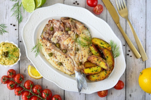 Подавайте дорадо на большом плоском блюде, выложив рядом горкой гарнир из молодой картошки. Соус тартар эффектнее всего подать в отдельном соуснике или красиво выложить ложкой прямо на тарелку рядом с рыбой. Дополните блюдо дольками лимона, веточками свежей петрушки и несколькими каперсами для украшения. Можно присыпать рыбу перед подачей крупной морской солью. Приятного аппетита!