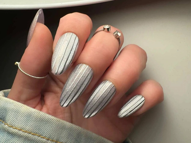 И тут нейл-мастера нас снова удивили. Они создали с этим лаком еще один дизайн, который сейчас активно набирает популярность в Сети и уже даже получил название ribbed-glass nails. В переводе с английского это звучит как «ребристо-стеклянные ногти», и название полностью отражает его суть. Главное здесь — не цвет и не количество декора, а свет и фактура. Поверхность ногтя делают рельефной, с тонкими вертикальными линиями, напоминающими грани винтажного стеклянного бокала или хрустальной вазы. Именно эти «ребра» создают игру света, блики и ту самую глубину, из-за которой маникюр хочется разглядывать бесконечно.