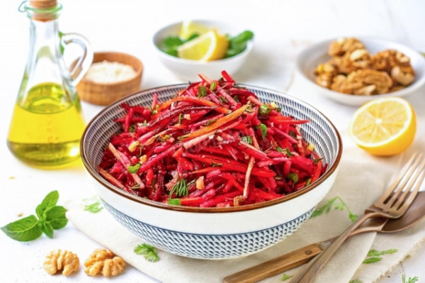 Салаты из сырых овощей и фруктов популярны в здоровом питании с древности. Сочетание свеклы с яблоком и орехами любят те, кто следит за своим питанием, благодаря способу нарезки и тому, что все овощи в салате находятся в сыром виде.
