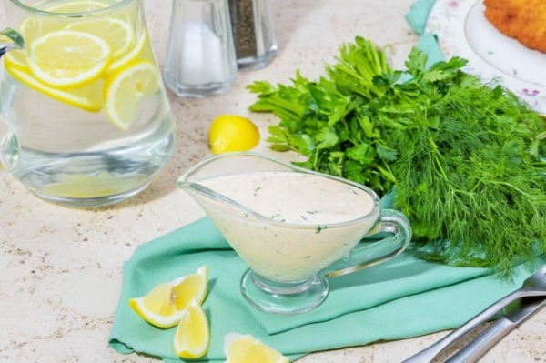 Варианты подачиПодавайте соус к жареной рыбе охлаждённым, в соуснике или креманке. Идеально к судаку, треске, лососю или жареной скумбрии. Украсьте веточкой укропа и долькой лимона.