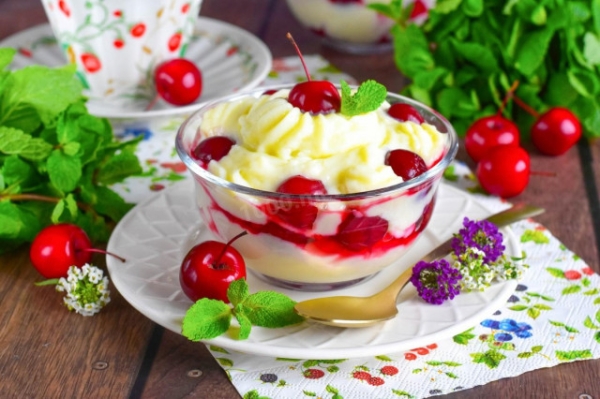Варианты подачиПодавайте заварной крем с вишней охлаждённым в креманках, слоями или отсаженным через кондитерский мешок. Идеально с чашкой чая, кофе или как прослойка для бисквитного торта. Украсьте листиком мяты или крошкой печенья.